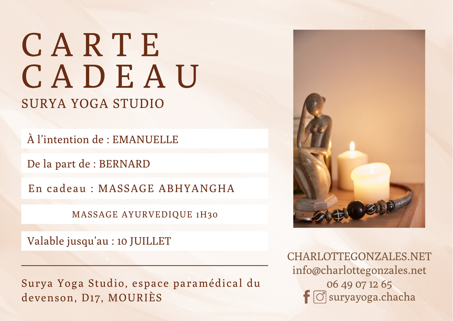 Les massages ont lieu à SURYA YOGA studio situé à l’espace paramédical du Devenson à Mouriès.